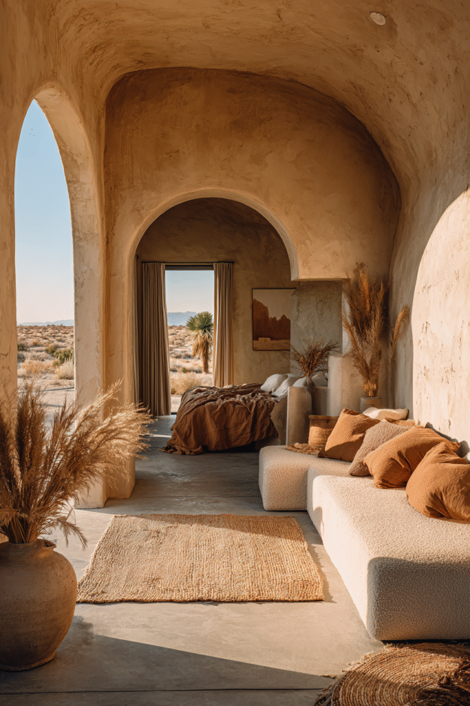The light peculiarly hits this place. It oozes softly over walls with texture, following the beautiful curves of sculptural archways that remind me of old desert buildings. The color scheme is a lesson in moderation: warm sand, clay, and sunbaked beige, with organic textiles and pottery that look like they sprang straight from the ground.