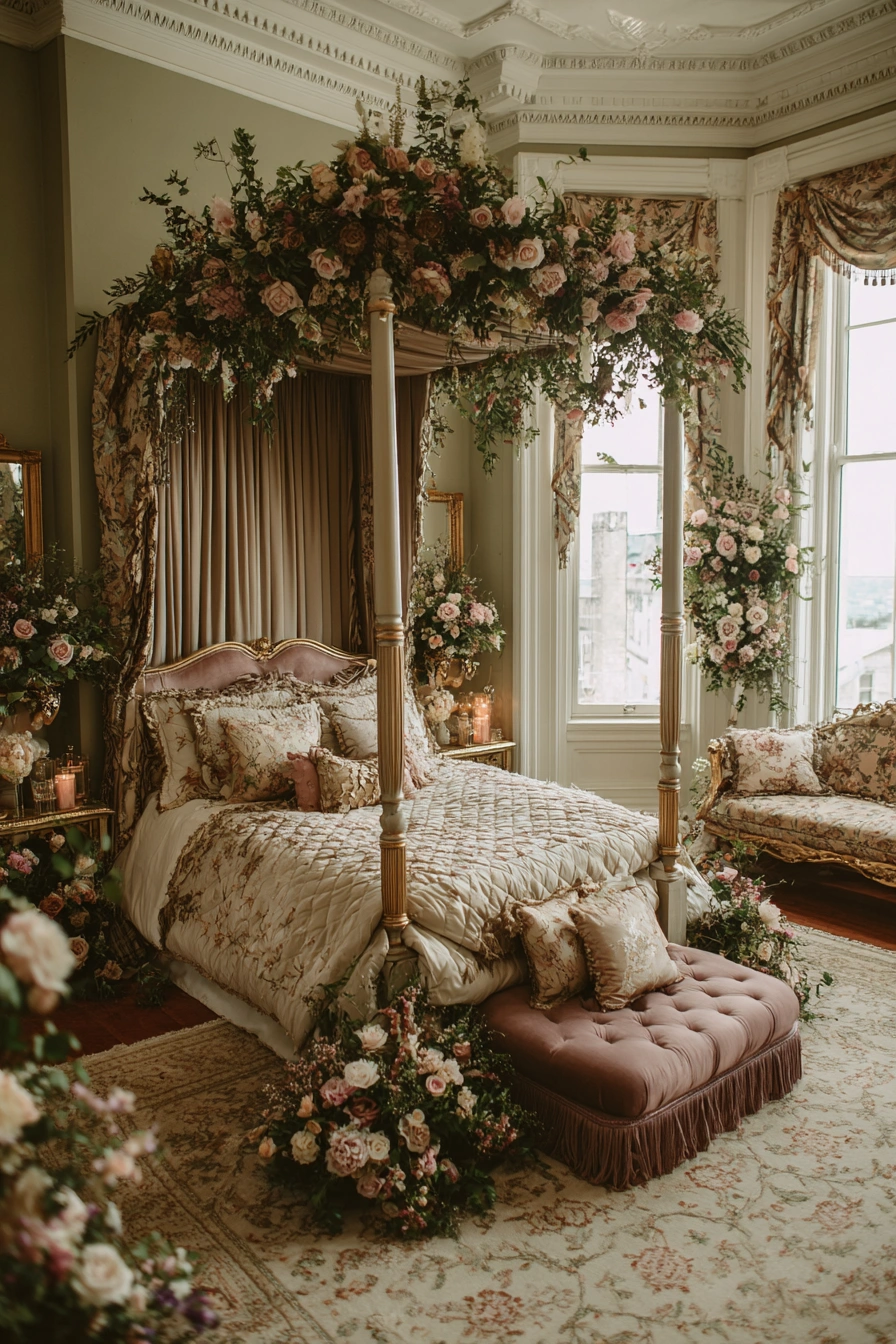 The world comes to life as you go inside. Flowers cover everything, including draperies, pillows, and vases, creating a tapestry of color and pattern. Tall windows let in streams of delicate light that get stuck in the folds of heavy silk drapes. The bedding has a lot of texture, like old tapestries, and the scattered decor pieces make it look like they have been collected and cared for for decades. This is a lived-in relationship where nothing is simple and everything has a story.
