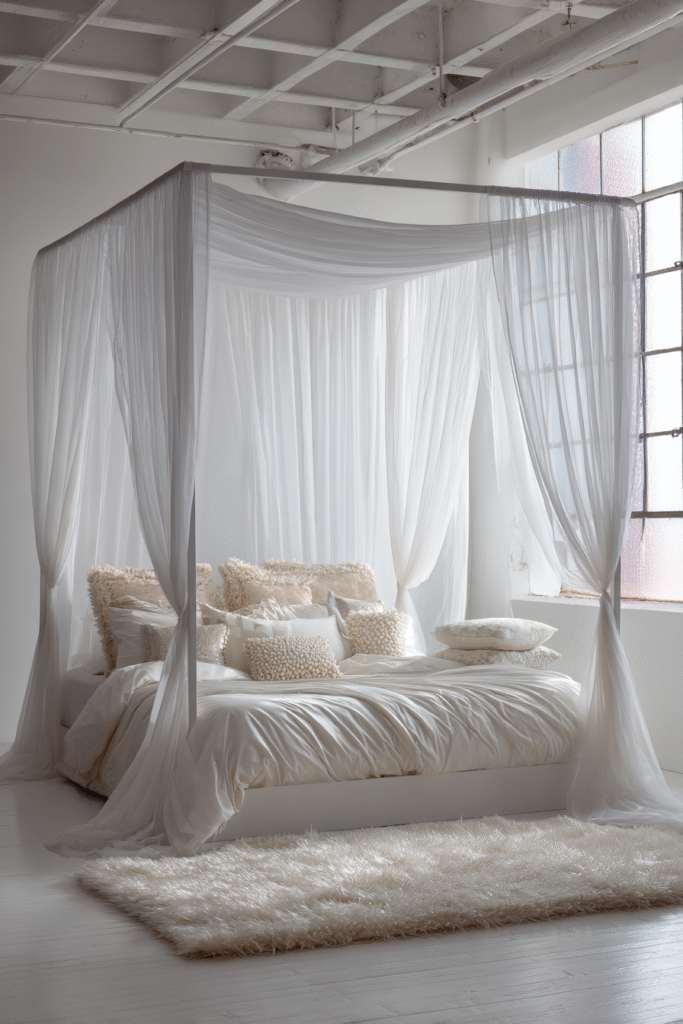 Light. Otherworldly. Soothing. The all-white colour scheme and soft textures in this bedroom make it feel like a dream. A sheer canopy flows around the bed, adding movement and defining the area with delicate, flowing lines. Light comes in the big windows and lights up the room’s layers of white, such as silky linen, textured pillows, and a soft rug. This gives the room depth without adding colour.