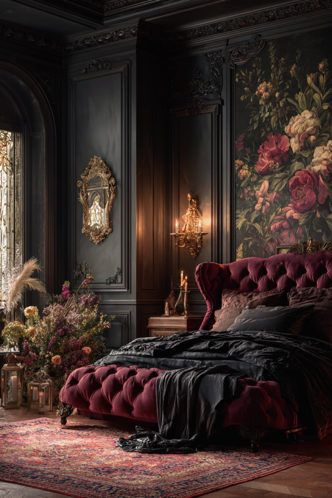 Drama happens in the dark. Deep floral murals cover the walls, and the artistic flowers create a background of passion and mystery. The tufted velvet headboard in dark burgundy stands out, and the black satin bedding adds to the sensuality. There are beautiful sconces and a golden chandelier that let candlelight shine through. The warm light bounces off the dark wood beams and polished floors.
