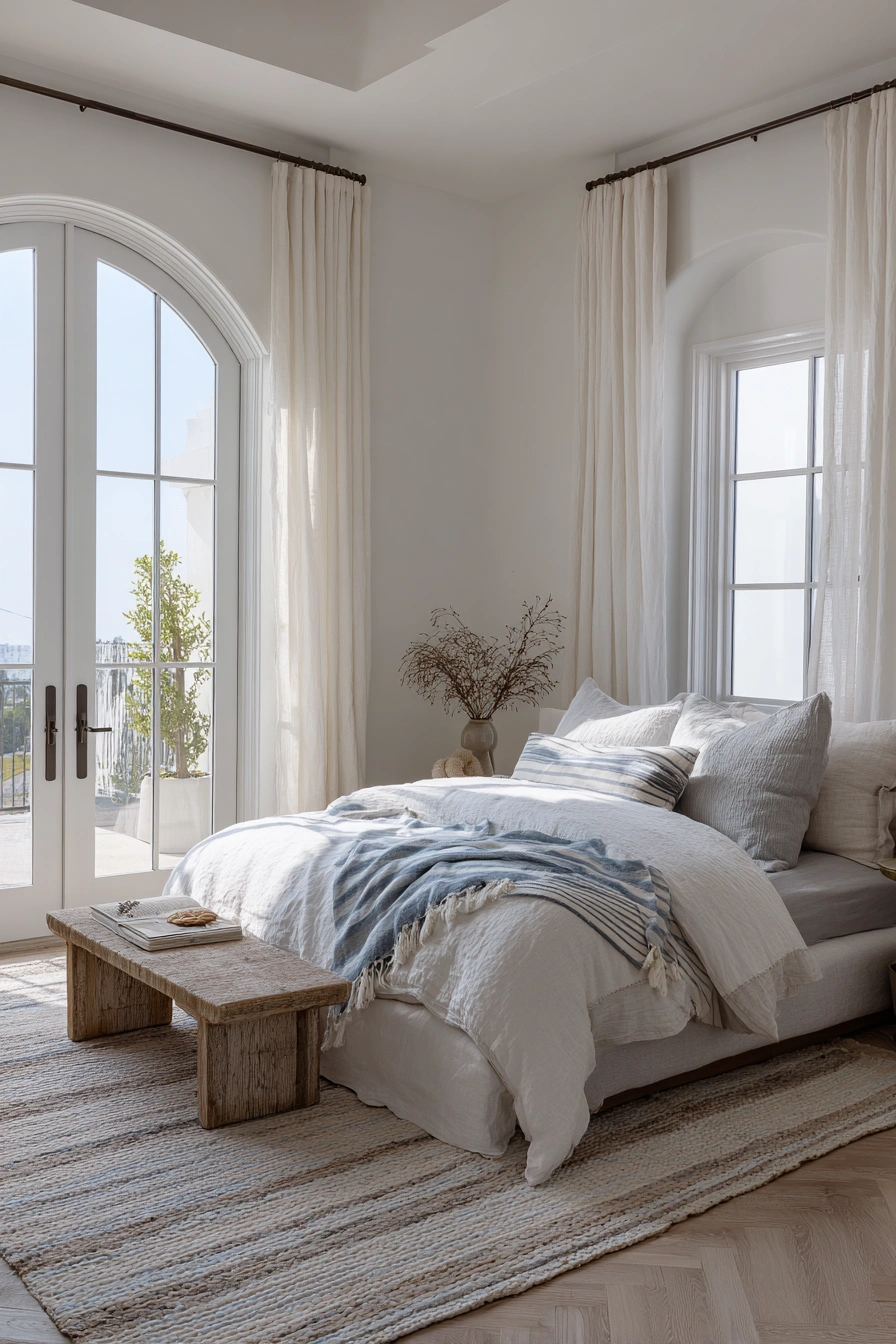 Light. Otherworldly. Soothing. The all-white colour scheme and soft textures in this bedroom make it feel like a dream. A sheer canopy flows around the bed, adding movement and defining the area with delicate, flowing lines. Light comes in the big windows and lights up the room’s layers of white, such as silky linen, textured pillows, and a soft rug. This gives the room depth without adding colour.