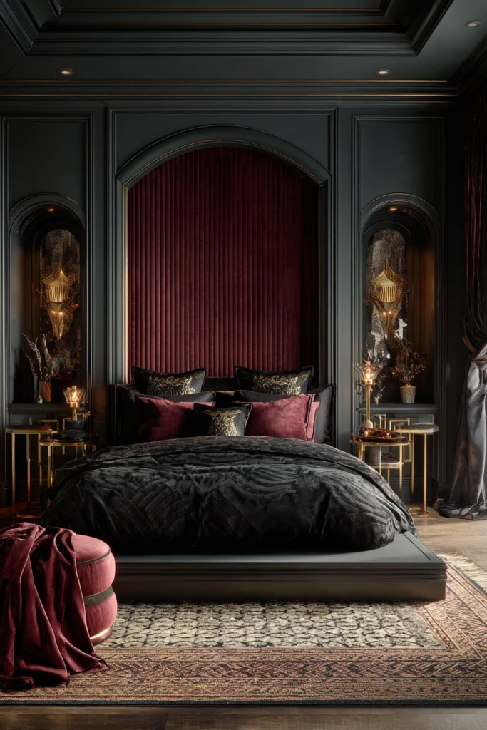 Moody. Dramatic. Luxurious. This guest bedroom channels Art Deco opulence with a contemporary twist. Deep charcoal walls frame the space, creating an intimate cocoon, while a rich burgundy headboard introduces tactile depth through vertical channeling. Black bedding with subtle patterns enriches the visual layers, evoking the sumptuousness of high-end hotel suites.