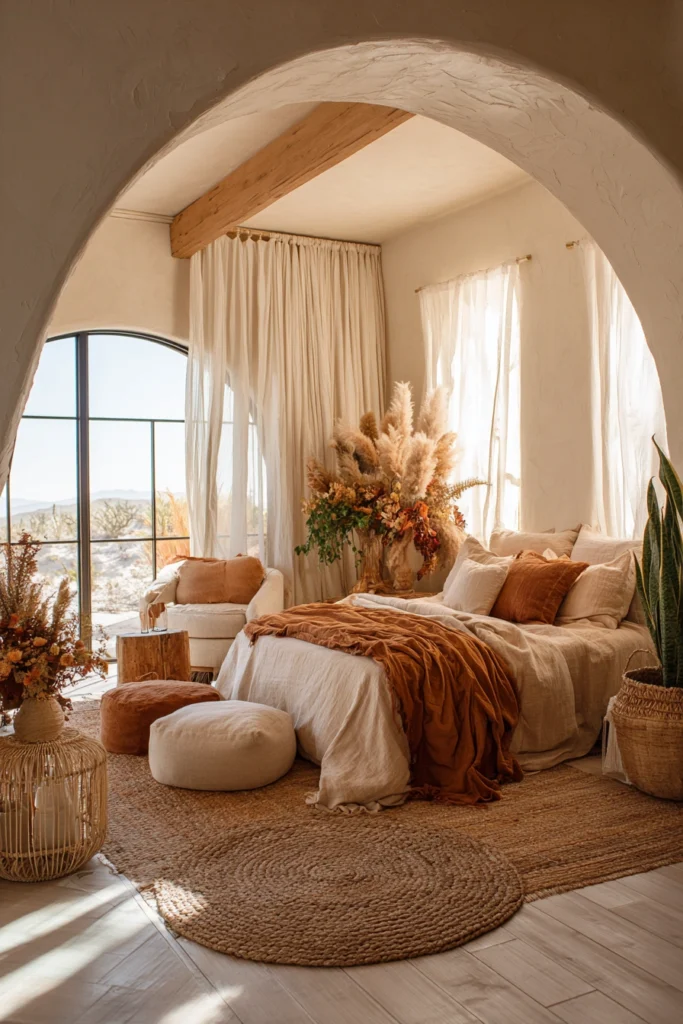 Layered textiles—linen bedding, woven rugs, fringed throws—add warmth while maintaining an airy feel. Burnt orange and clay tones, echoed in cushions and drapery, connect the room to desert landscapes outside. Pampas grass arrangements and dried florals enhance organic character, reinforcing the connection between interior and nature.
