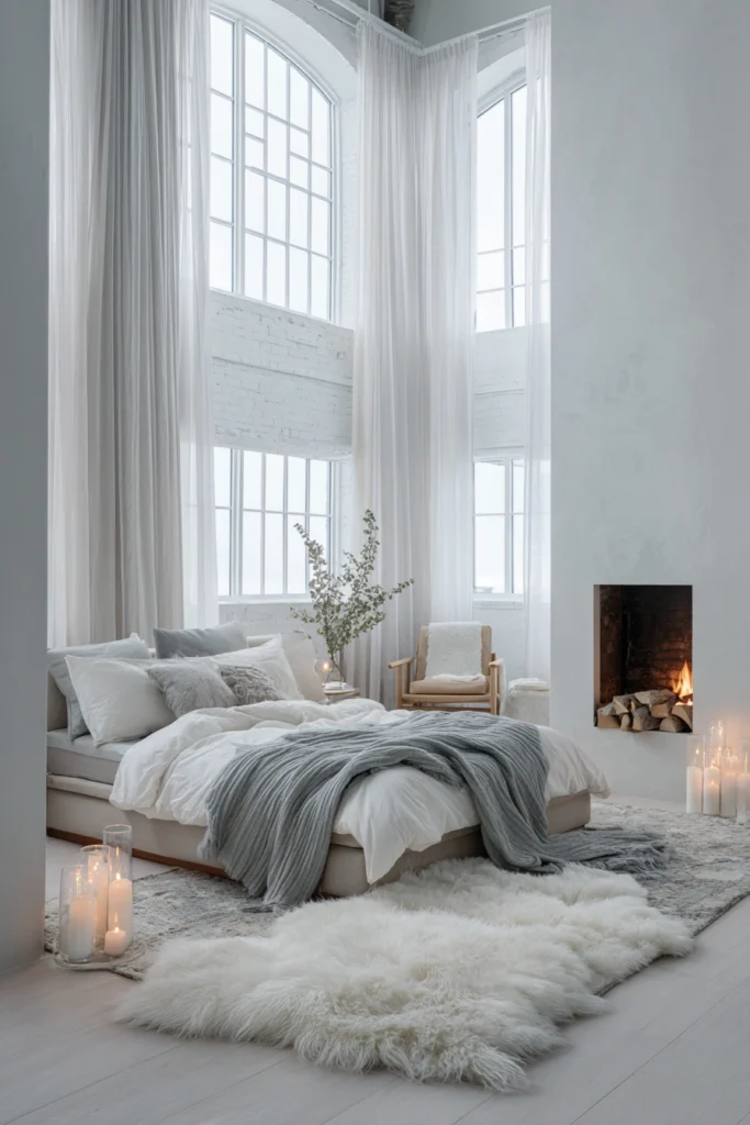 Layered textures define comfort—plush faux-fur rugs, thick knits, and smooth cotton bedding work in harmony to build tactile richness. A muted palette of whites and grays keeps the room serene, while a hint of natural wood adds grounding warmth. The small fireplace, paired with scattered candles, introduces a cozy glow against cool tones, balancing coldness with intimacy.