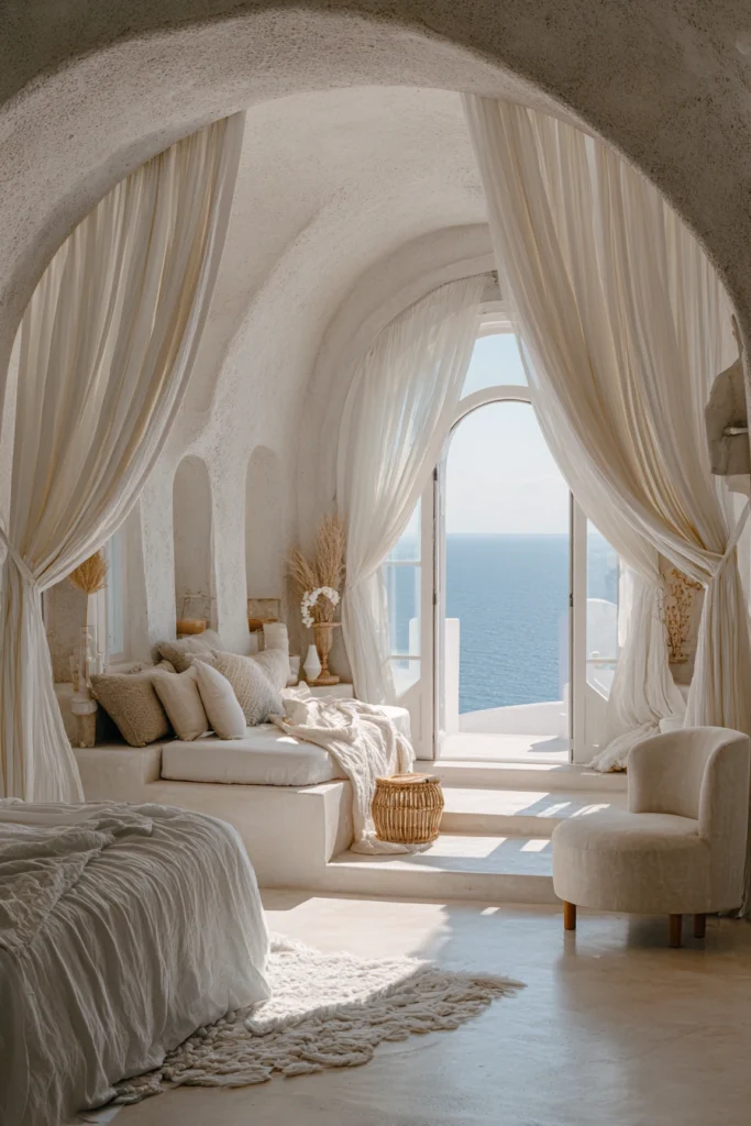 Airy. Fluid. Tranquil. This guest bedroom celebrates coastal serenity through an architectural design that blurs boundaries between indoor comfort and oceanic vastness. Curved stucco ceilings and soft arches frame the space, echoing Mediterranean cave-style dwellings. Flowing drapes in creamy tones capture the sea breeze while diffusing sunlight into a gentle glow.