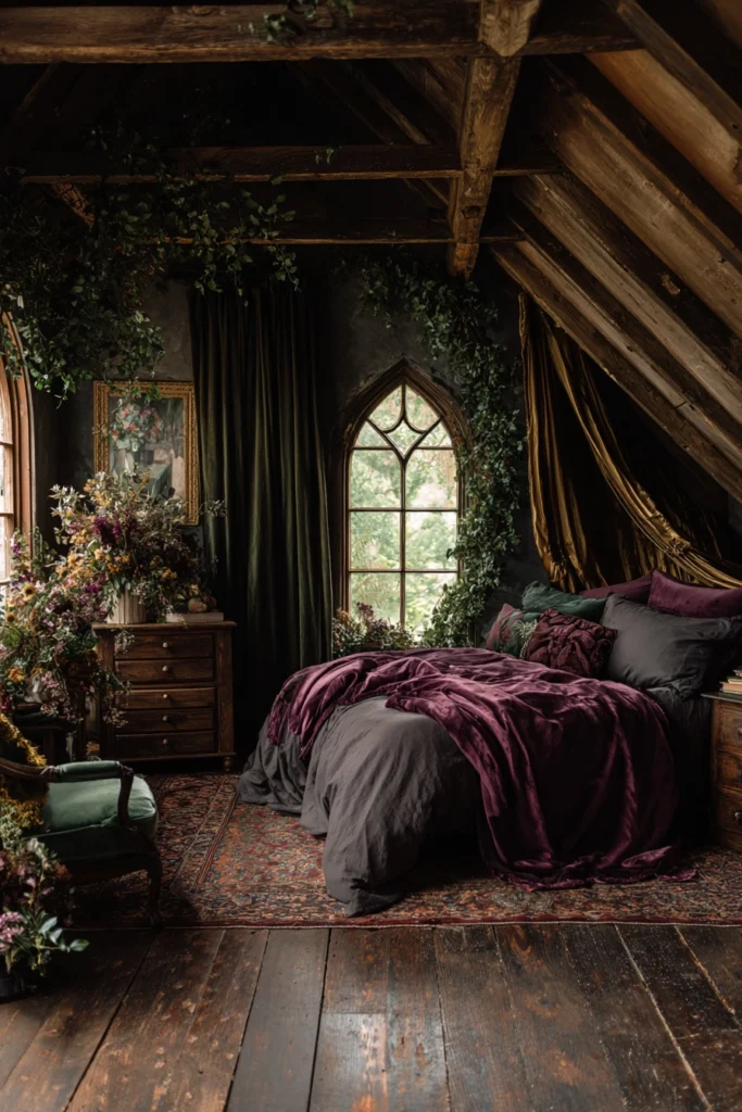 Velvet bedding in deep plum contrasts with charcoal sheets, creating a rich, moody palette. Gothic-inspired arched windows filter soft light, enhancing dramatic shadows across textured walls. Abundant floral arrangements, wild and untamed, infuse organic vibrancy, reinforcing the room’s enchanted atmosphere.