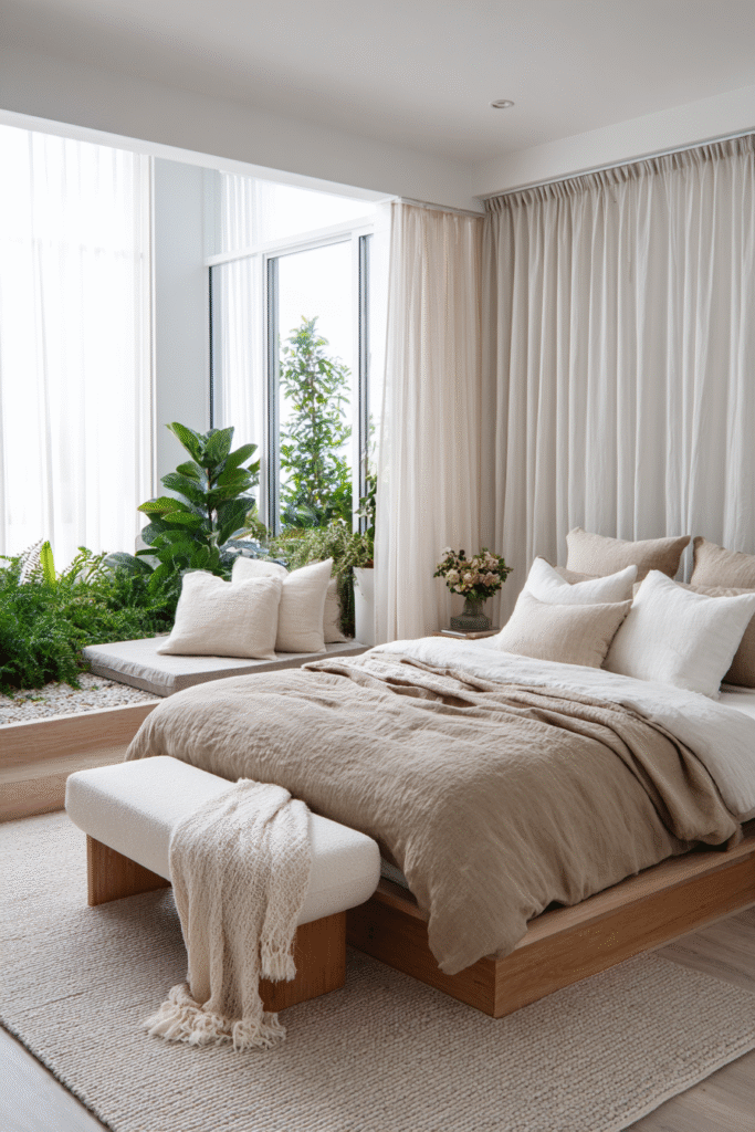 Large windows pull daylight deep inside, connecting the interior to the greenery beyond. Indoor plants, arranged at varying heights, incorporate biophilic design, which is known to enhance well-being and relaxation. A low wooden bed anchors the room, keeping proportions grounded and simple. Linen bedding adds texture, preventing sterility while boosting comfort.